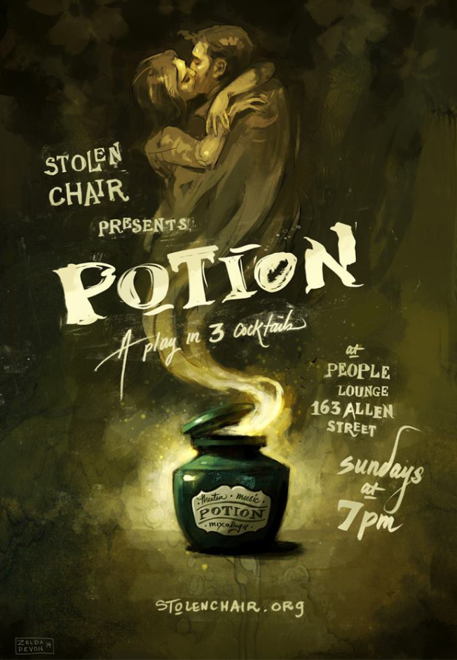 Charley sells potions, handcrafted and custom made—from potions that can make the forgetful remember to potions that will stop a compulsive liar from fibbing. But the one potion Charley hasn’t been able to master is that one she wants for herself: a love potion. Potion, a “spoken word opera” that immerses its audience in the giddy world of Charley’s bar, was originally accompanied by live original music and a flight of 3 original “potions” created by award-winning mixologist Marlo Gamora.